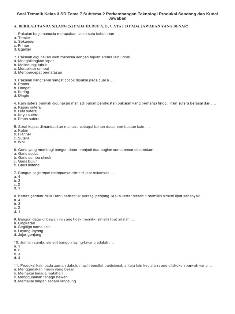 Soal Tematik Kelas 3 Sd Tema 7 Subtema 2 Perkembangan Teknologi Produksi Sandang Dan Kunci Jawaban